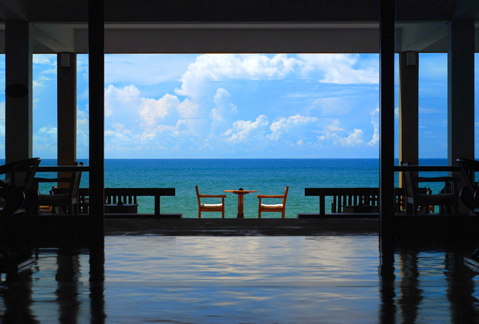 A testament to the genius of Geoffrey Bawa - the verandah overlooking the rocks bordering the Indian Ocean is a favourite location for visitors